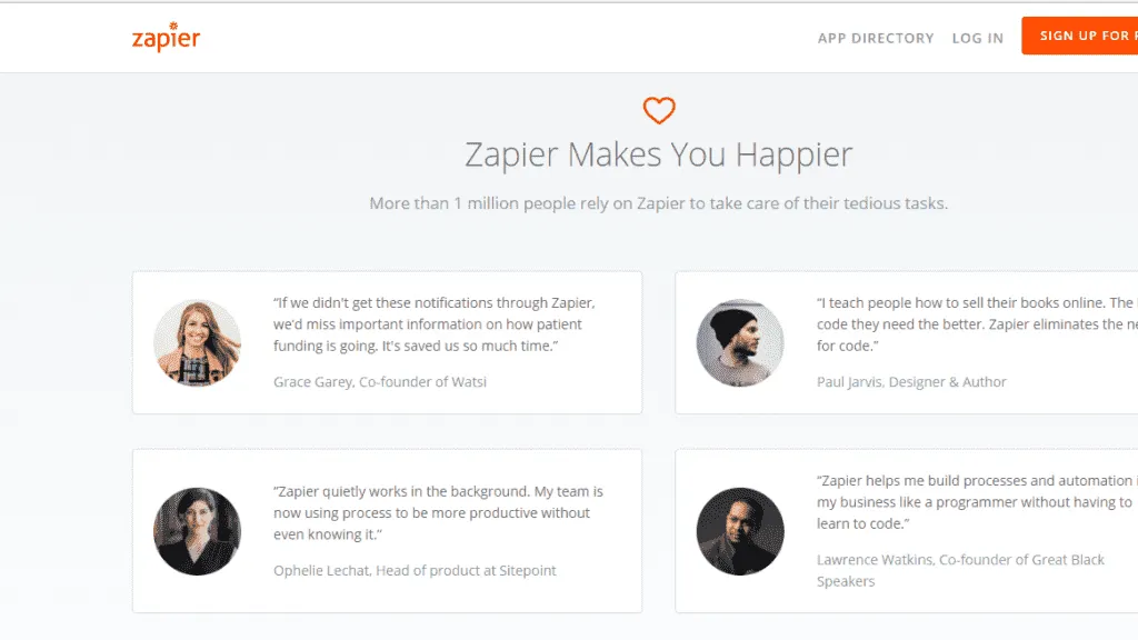 Research by ConversionXL found that testimonials performed best. Testimonials are statements that “testify” as to the quality of the product or service.Just how powerful are testimonials? Research found that they are capable of increasing conversions by as much as 34%.Testimonials can come from your customers or industry experts (in the form of media mentions), but here is an example of some customer testimonials on Zapier’s homepage.
