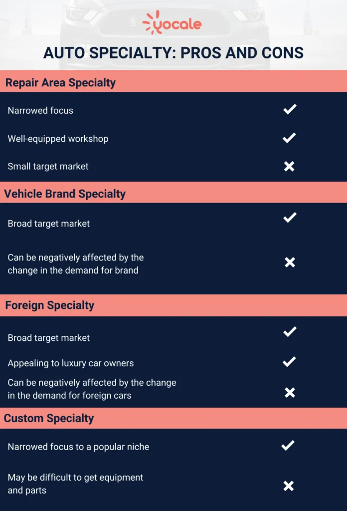 Consider specializing in the repair of custom vehicles or those with aftermarket upgrades (e.g., hot rods). There’s also repair area specialization such as wheel and alignment services, tire rotations, electronic and electrical system repair, etc.