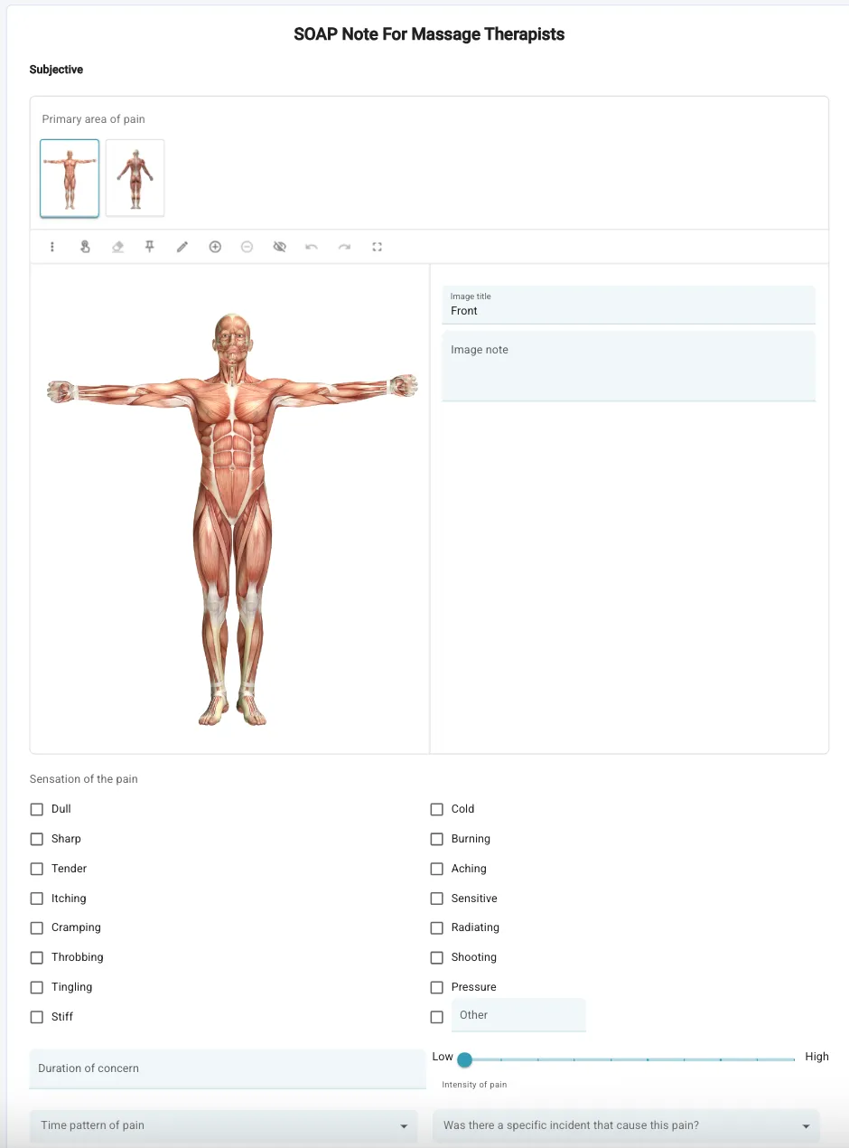 During a client’s first visit, SOAP notes help establish a clear foundation for future care. Document the client’s reported symptoms, pain scale, health history, and treatment goals. This creates the baseline that every future massage therapy progress note will refer back to.